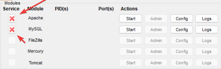 Installing services: When XAMPP opens up click the ❌ button on the left side of Apache and MySQL and install the services.